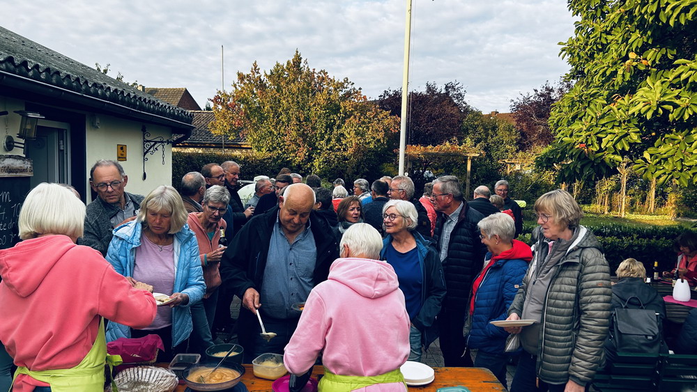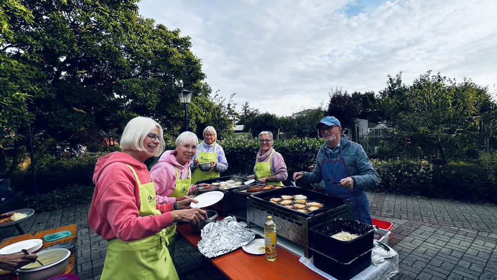 Ziel der Tour war die Kleingartenanlage Telgengrund, wo bereits alles für einen geselligen Abend vorbereitet war. Der Vorstand hatte ganze Arbeit geleistet: Bei frisch gebackenen Reibekuchen mit Apfelmus und kühlen Getränken ließ die Gruppe den Abend in entspannter Atmosphäre ausklingen.