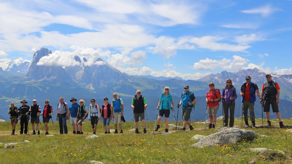 Wanderung bei sonnigem Wetter und dem Blick auf die Dolomiten mit dem